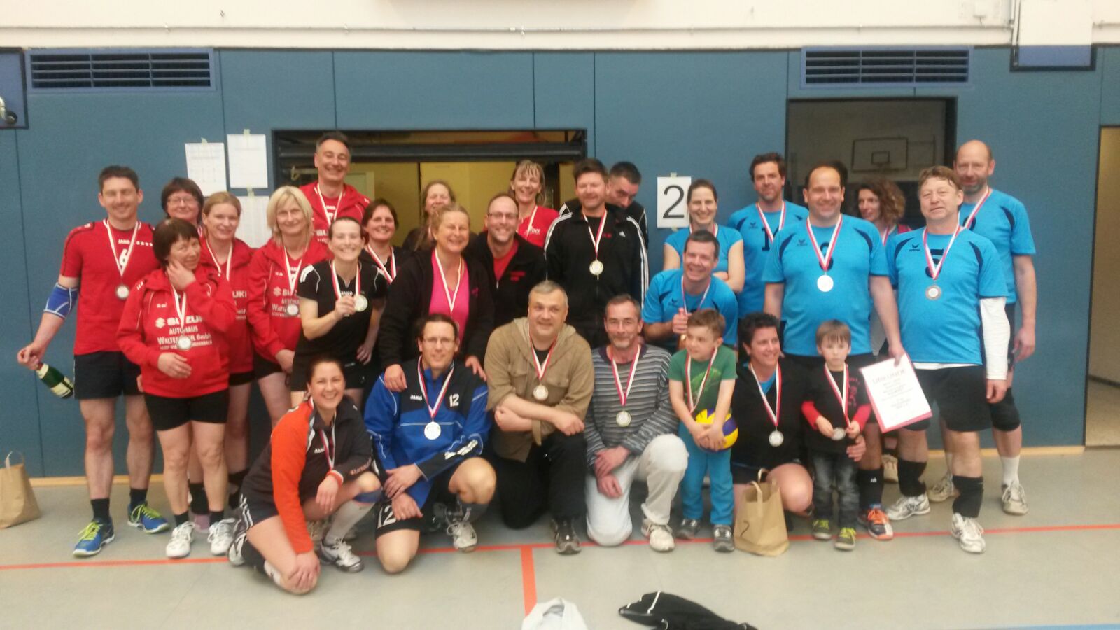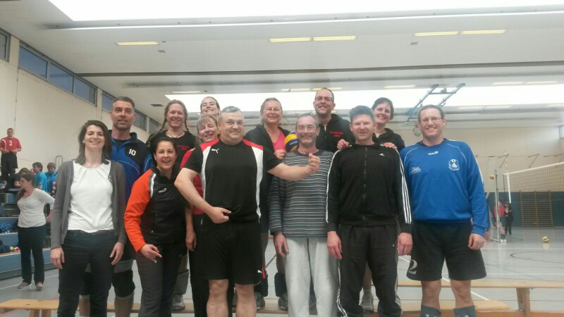 Unsere Vorgruppe schien auf den ersten Blick etwas leichter zu sein als die andere Vorgruppe. Wir spielten verschiedene Aufstellungen durch und konnten eigentlich alle Spiele mehr oder weniger souverän gewinnen. Doch halt ... nicht alle! Obwohl ich vor dem Turnier aus den Erfahrungen der letzten Jahre extra angesprochen habe, dass wir gegen jeden Gegner zunächst voll konzentriert in das Spiel gehen müssen, klappte das gegen die neu angetretene Mannschaft aus Ueberau nicht. Von Außen hatten man den Eindruck, dass unsere Mannschaft volleyballspielen verlernt hat. Der Satz ging 8:16 verloren und ich glaube, wir haben alle Punkte davon gemacht. Eine unglaubliche Fehlerquote unseres Teams und kein aufbäumen sich dagegen zu wehren war zu verspüren. Jeder spielte nur für sich, rollte mit den Augen und machte dann selbst den nächsten haarsträubenden Fehler. Wir wechselten dann zwar etwas im zweiten Satz, hatten den Gegner aber stark gespielt. Eine 13:10 Führung konnte nicht gehalten werden und man trennte sich mit 13:13 Punkten. Danach war erst mal Schweigen und Bier trinken angesagt. Aufgrund der anderen Spielergebnisse hatten wir aber Platz 1 in unserer Gruppe gesichert und nahmen diese gefühlte Niederlage als Lernprozess mit.