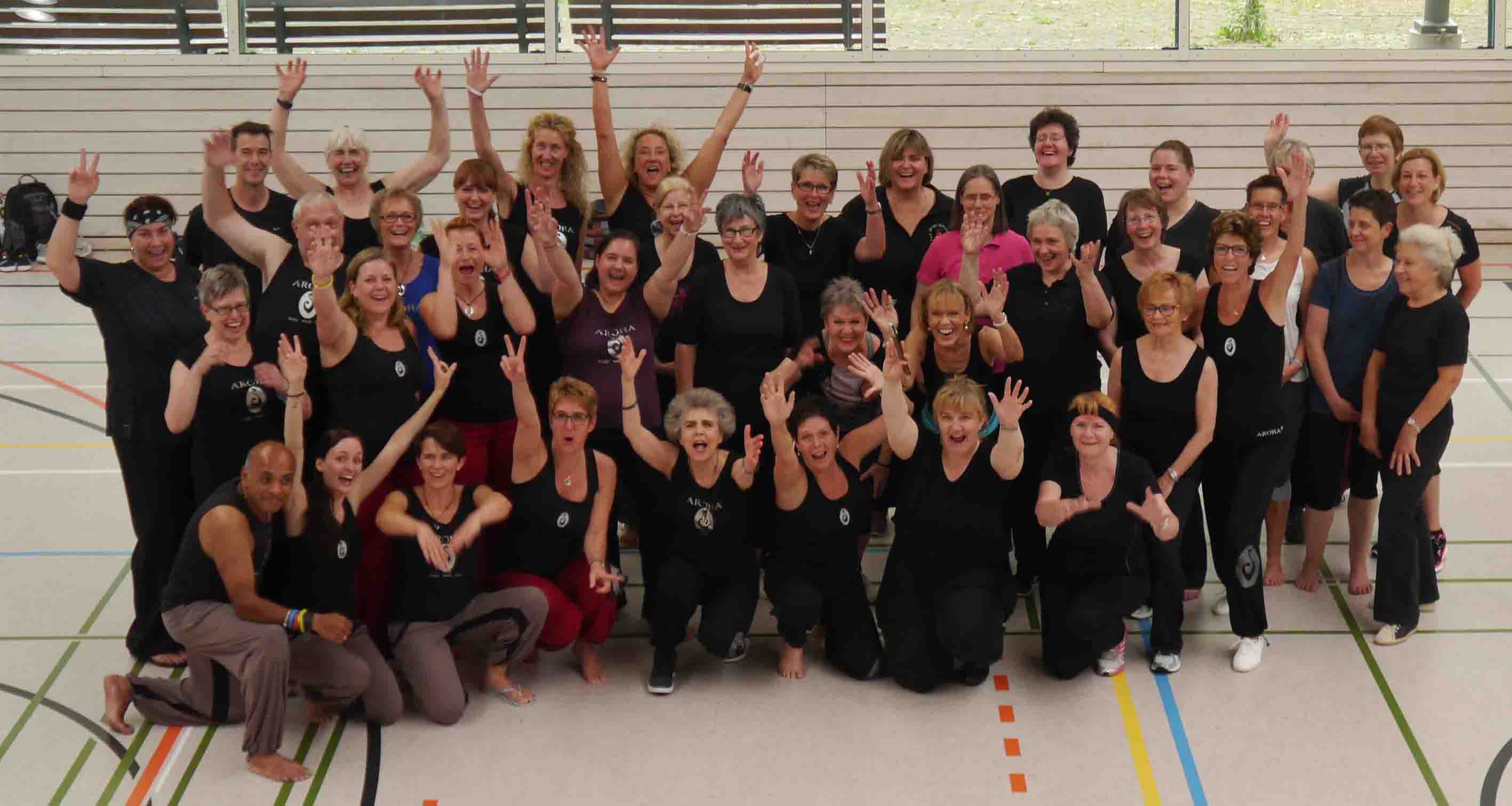 AROHA® (die bedingungslose Liebe) ist nun 3 Jahre alt geworden, drei tolle Jahre in unserem Verein. Und wir haben gefeiert, es war eine gelungene Geburtstagsfeier, ein gelungener Workshop. So viel Vorfreude und nun ist alles vorbei. Gezählt wurden etwa 60 Teilnehmer (aktive plus sich wechselnde nichtaktive Zuschauer), Vereinsmitglieder, AROHA®-Kursteilnehmer, deren Freunde und Familienmitglieder und meine AROHA®-Trainer-Kollegen aus Nah und Fern (Hessen, Rheinland-Pfalz, Thüringen und Bayern). Eine große Gemeinschaft hat sich getroffen, um einen Workshop zu genießen, zu gestalten, die Begeisterung für das effektive Ganzkörpertraining AROHA® zu demonstrieren. Die Stimmung war super. Mein Dank an alle Teilnehmer.