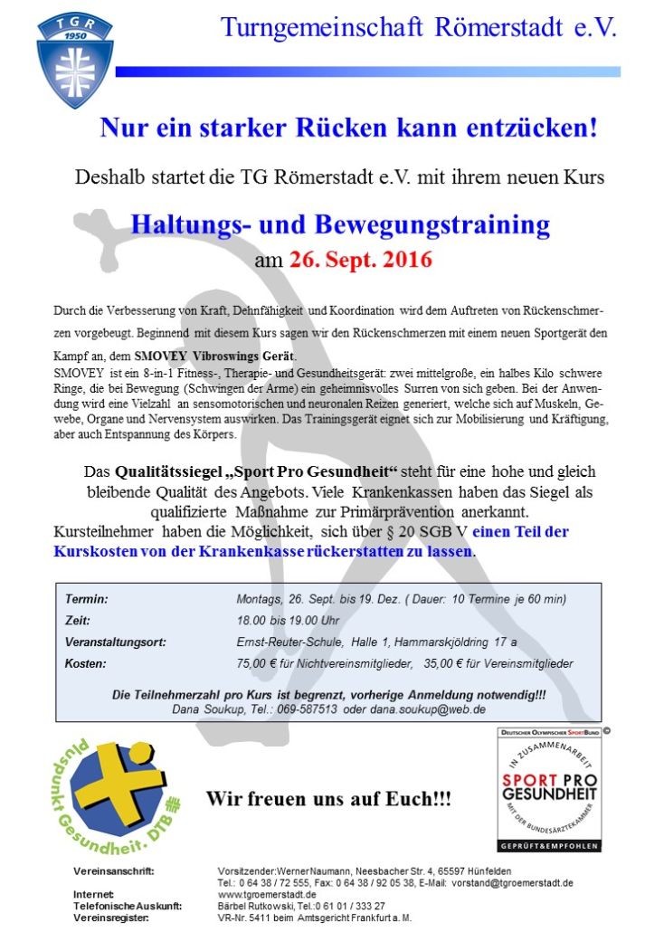 Am Montag, den 26. September 2016 starten wir mit unserem Kurs - „Haltungs- und Bewegungstraining“.