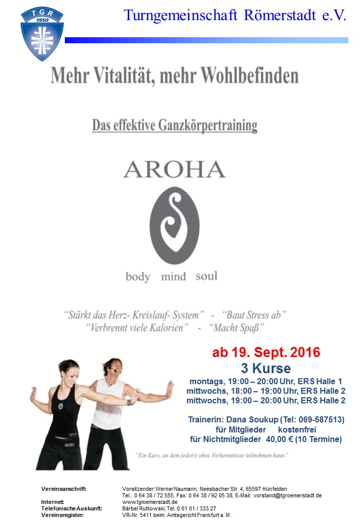 Nähere Informationen sind unter www.tgroemerstadt.de zu finden. Anmeldungen bei Dana Soukup (069 / 58 75 13, E-Mail: dana.soukup@web.de). Gerne laden wir zu einer AROHA® Schnupperstunde ein.