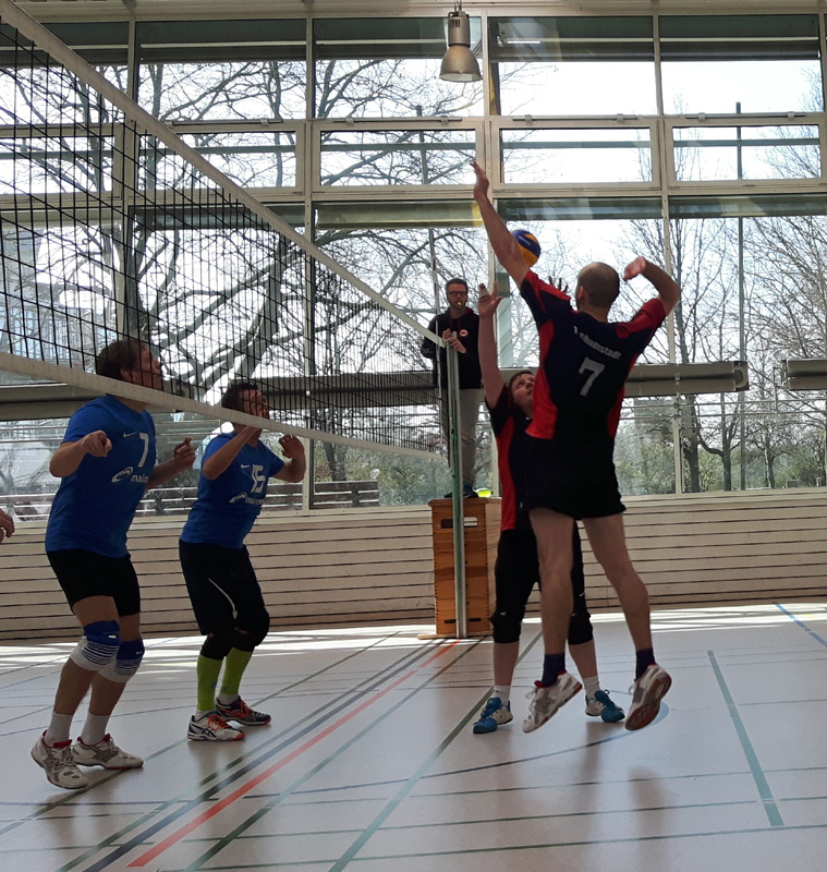 Gestartet waren unsere Herren gegen den bereits feststehenden Meister vom TV Seckbach ohne ihren starken Außenangreifer Hanno Schäfer. Die Gäste ihrerseits mussten nur auf Diagonalmann Armin Seitz und Zuspieler Robi Bricl verzichten. Erster gegen Letzter, ein Sieg musste her, um überhaupt eine Chance auf den Klassenerhalt zu haben. Überraschend entspannt und zielsicher gingen unsere Herren ans Werk und düpierten den Meister schnell mit 10:3, ehe Seckbach ins Spiel fand. Doch die Römer brachen schnell ein und mussten bei 14:15 den ersten Rückstand hinnehmen. Ab da entwickelte sich ein ausgeglichenes Spiel, bis die Römer erstmals bei 20:18 dank konsequenter Blockarbeit die Siegesstraße betraten. Nach umkämpften 25 Minuten war der Satz überraschend mit 25:20 gewonnen.