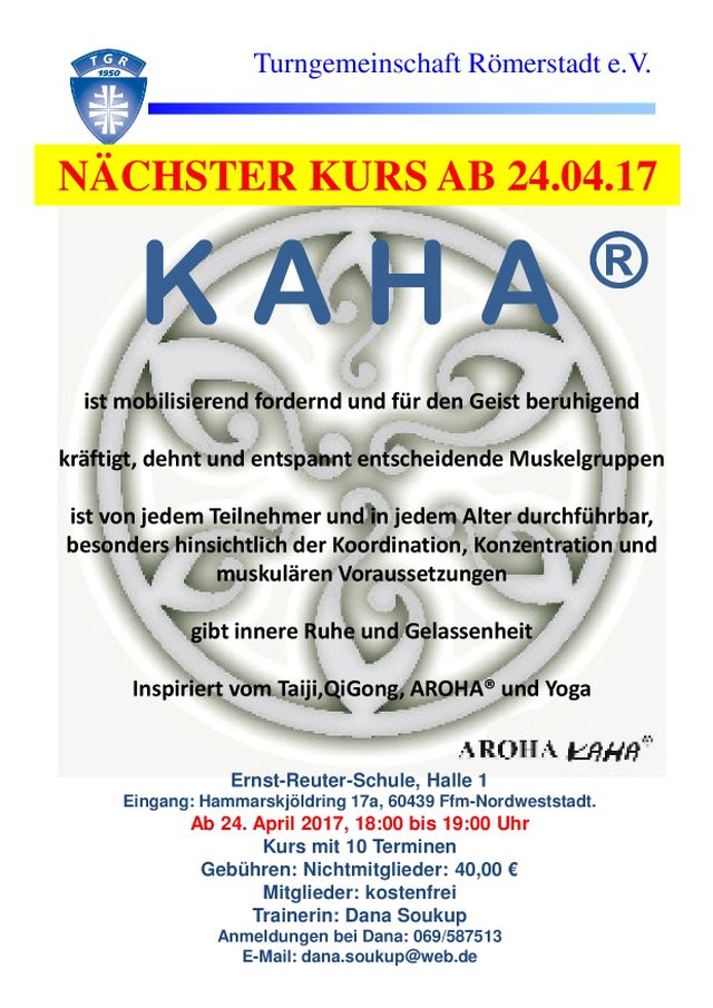 Das „energiegeladene, starke und mutige“ Sportprogramm von Bernhard Jakszt, dem Entwickler von AROHA® läuft nun in unserem Verein weiter, hat viele Interessenten gefunden. Ab Montag, dem 24.04.2017 starten wir die zweite Kursrunde 2017 (für Vereinsmitglieder ein festes Angebot).
