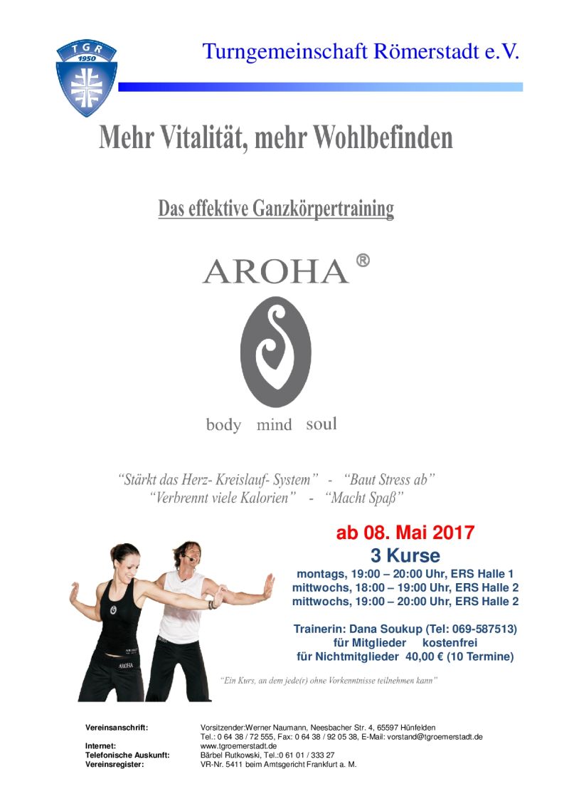 Ab 08. Mai 2017 startet in unserem Verein die zweite AROHA® Kursrunde in diesem Kalenderjahr. AROHA® - Ganzkörpertraining für mehr Vitalität und mehr Wohlbefinden. Wir tanzen uns fit mit dem Kriegstanz der Maoris aus Neuseeland. Wann und wo siehe Flyer.
