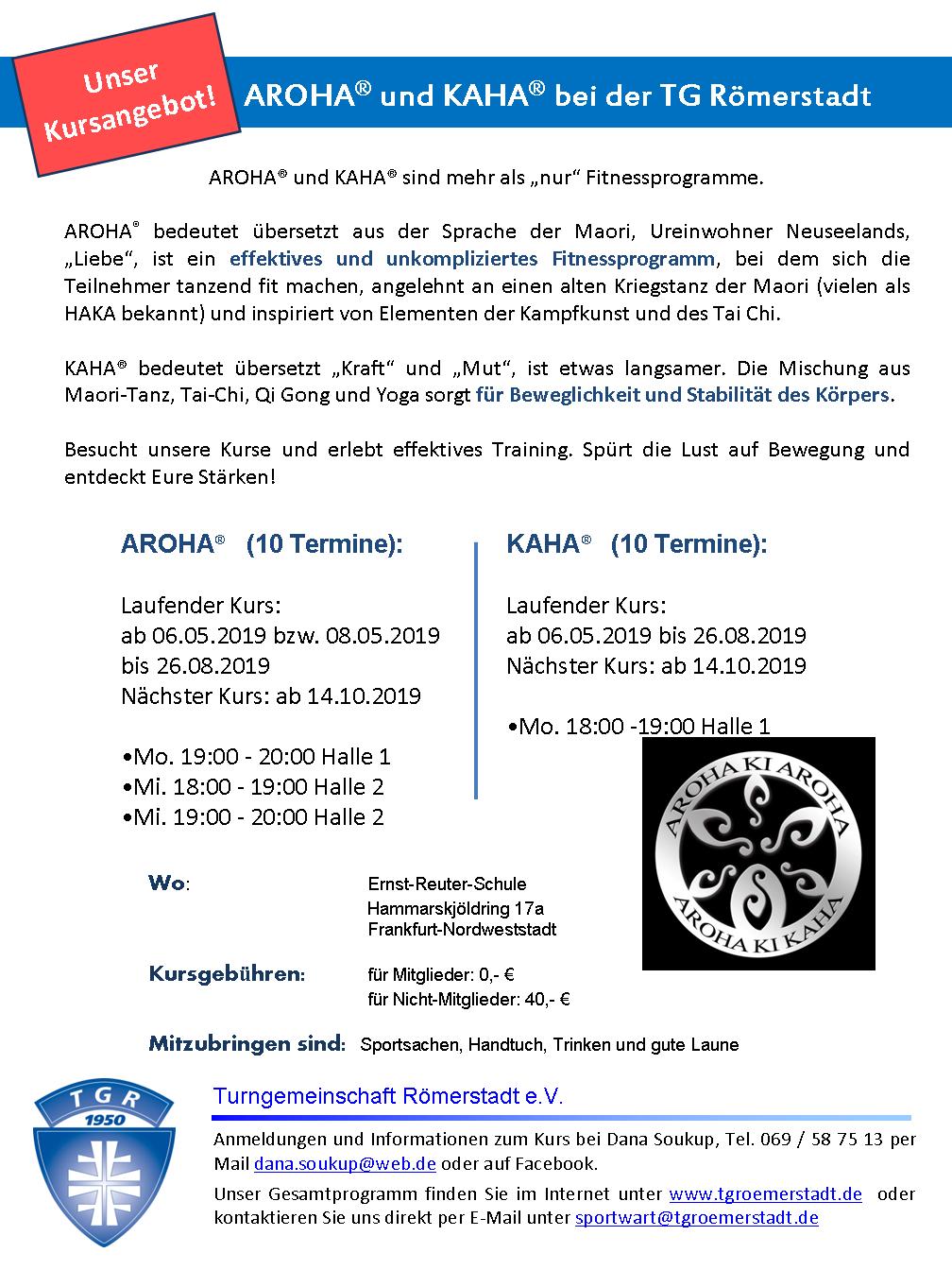 Es werden drei AROHA® Stunden und eine KAHA® Stunde pro Woche angeboten in den Sporthallen der Ernst-Reuter-Schule Halle 1 bzw. 2. Alle Angaben sind auf der Homepage unseres Vereines (www.tgroemerstadt.de) zu finden oder aus dem Anhang zu entnehmen. Gerne beantworte ich weitere Fragen entweder telefonisch oder auf dem elektronischen Wege. Einstieg ist jederzeit möglich, Jeder kann mitmachen, es sind keine Vorkenntnisse erforderlich.