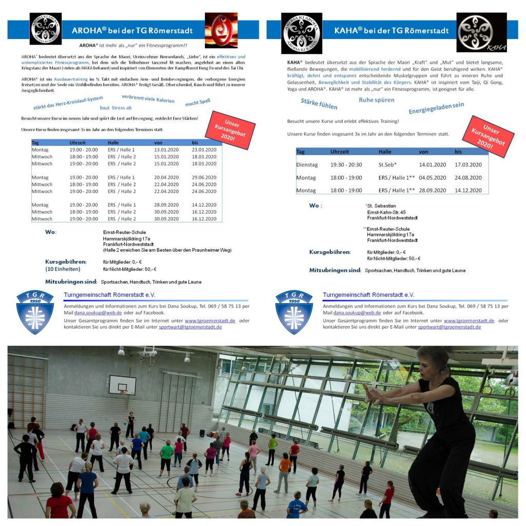 Ab dem 13.01.2020 starten wir in unserem Verein mit weiteren Kursrunden. Es werden drei AROHA® Stunden und eine KAHA® Stunde pro Woche angeboten. Alle Angaben sind auf der Homepage unseres Vereines (www.tgroemerstadt.de) zu finden oder aus dem jeweiligen Anhang (Flyer) zu entnehmen. Gerne beantworte ich weitere Fragen entweder telefonisch oder auf dem elektronischen Wege. Einstieg ist jederzeit möglich. Jeder kann mitmachen, es sind keine Vorkenntnisse erforderlich.