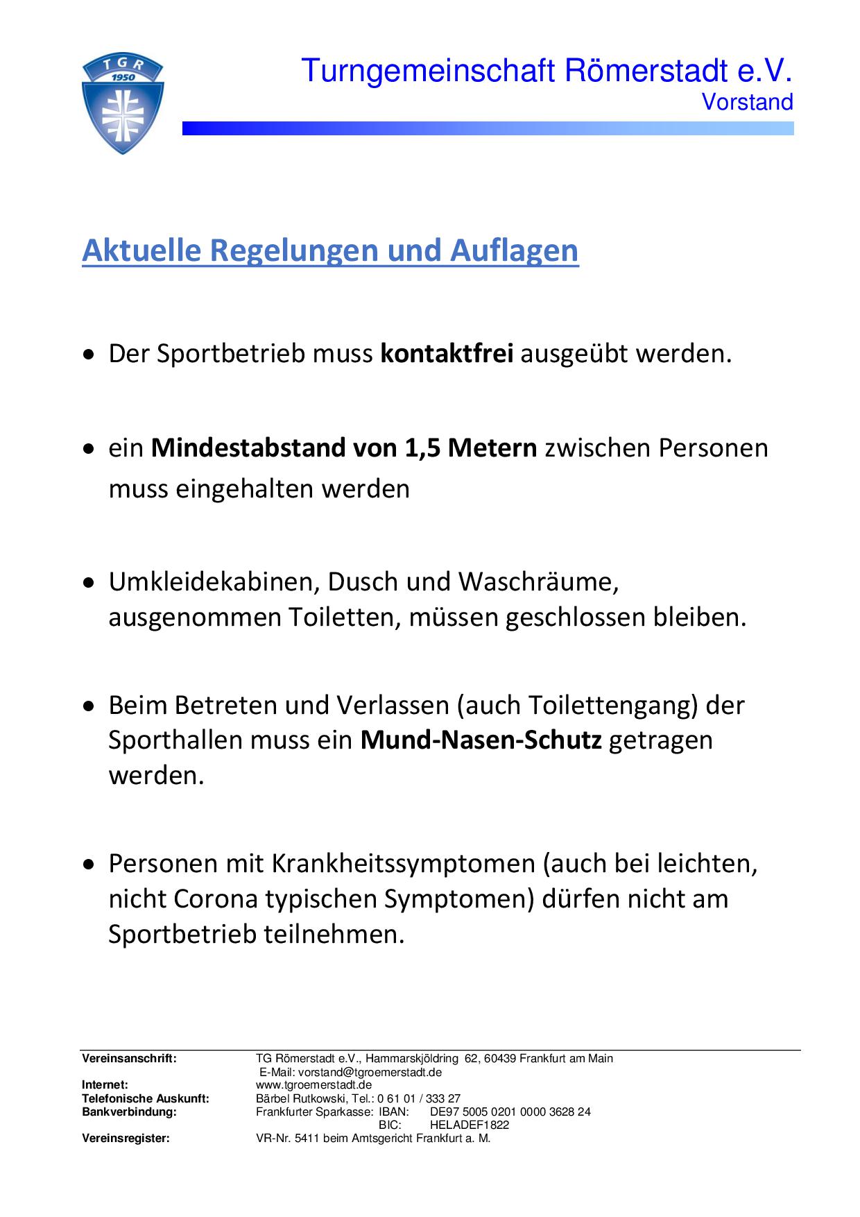 Seit Wochen werden wir mit Empfehlungen überhäuft und auch uns vom Verein ist es sehr wichtig, dass wir Diese ernst nehmen. Wir sind froh, dass es inzwischen einige Lockerungen gibt, aber im Interesse der Allgemeinheit und zum Schutz unserer Mitglieder ist es uns vom Vorstand sehr wichtig, dass unsere Mitglieder pflichtbewusst handeln. Wir erwarten, dass sich alle Personen, die an unseren Kursen teilnehmen, an die allgemeinen gesetzlichen Vorgaben halten. Die wichtigsten Regelungen für den Sportbetrieb haben wir in der beigefügten Grafik zusammengefasst. Bitte berücksichtigt die Umsetzung dieser Vorgaben und achtet auf ausreichende Hygiene- und Desinfektionsmaßnahmen. Hierfür werden wir Handwaschseife und Desinfektionsmittel für die Geräte zur Verfügung stellen. Dennoch wollen wir die Kontakte auf ein Minimum reduzieren, daher haben wir unsere ÜbungsleiterInnen dazu angehalten möglichst auf die Nutzung von Geräten zu verzichten. Außerdem werden wir für jede Stunde eine Anwesenheitsliste führen, um im Ernstfall mögliche Infektionsketten nachvollziehen zu können.