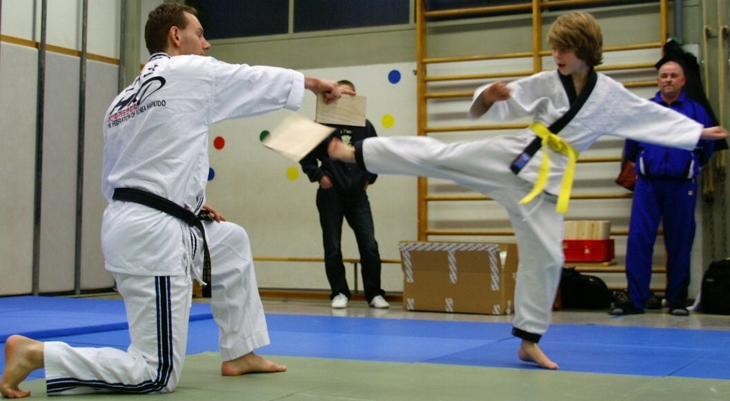 Das fleissige Trainieren wurde belohnt. Bei den Falltechniken, der Faustschlag-Kata, den Fußtritten aus dem Stand und der Bewegung, dem Freikampf, dem Bruchtest und der Demonstration verschiedenster Abwehr- und Angriffstechniken wurde den Prüflingen einiges abverlangt.