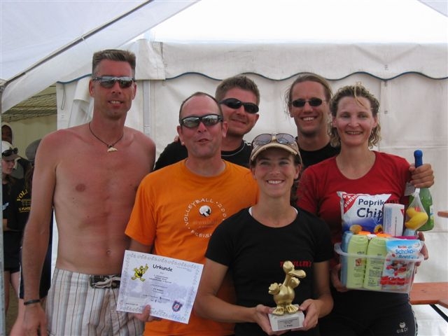 16.08.2009 - Volleyball (Nnn) Eine äußerst erfolgreiche Sommersaison konnten wir mit einem weiteren Turniersieg beenden. Wenn wir das Streichergebnis Mömlingen mal weglassen (was im Vorfeld schon unter einem unglücklichen Stern stand) waren wir in allen anderen Turnieren jeweils unter den Top Drei vertreten. Doch nun zum Turnier: Freitags Anreise und Eröffnungsparty. Diese ging ruhig, nach ca. 10 Körbchen Bier so zwischen 24:00 Uhr und 2:00 Uhr Morgens zu Ende. Samstag: Da Liane leider kurzfristig krankheitsbedingt ausfiel, waren wir nur sechs Spieler. Glücklicherweise lies der Spielmodus auch ein 2/4 System zu. So das wir grundsätzlich mit der Formation; Pia Steller, Andi Diagonal, Schnulli und Ole Mitte, Bina und Stefan Außen, antraten. In der Profi-Liga mit 18 Teams gestartet, verloren wir keinen Satz in unserer Sechsergruppe. Die eigentlich beste Mannschaft schlugen wir in einem Satz zu 3 Punkten!!!. Highlight Schnullis Block, der doppelt so fest wie der Schlag zurück kam und eine Sonnenbrille in mehrere Teile zerlegte. Immer schön wenn die Gegner aufs Feld kommen und als Ziel vorgeben mehr wie 10 Punkte machen zu wollen. Danach konnten wir uns auf die Samstagsparty vorbereiten. Ich schonte mich wieder ein wenig um den Rest der Mannschaft dann für Sonntag morgens fitt zu bekommen. Es zunächst eine Zwischenrunde gespielt, in der wir jeweils gegen einen Gruppenzweiten und Gruppendritten antraten. Die Gegener wären an sich kein Problem gewesen, hätte sich Ole nicht gleich im ersten Spiel einen Bänderiss ohne Fremdeinwirkung zugezogen. Das auch noch im zweiten Satz bei 24:10 Punkten für uns! Wir suchten Ersatz und fanden eine guten und soliden Spieler einer befreundeten Mannschaft. Dieser hies natürlich, wie sollte es anders sein, auch Stefan. Unser Stefan, nicht Schnulli, jetzt wirds kompliziert, rückte in die Mitte und machte einen guten Job. Ein Spiel später waren wir dann in der finalen Dreiergruppe und unser Mindestziel einen Entchenpokal zu gewinnen war erreicht. Wer den bekommen sollte war dann klar. FightvorOle statt FightforVeit war diesmal angesagt. Wir mussten gleich gegen den letzjährigen Turniersieger, die Spiderschweine, ran. Frauen RL und Männer LL. Wir starten sehr konzentriert und gewannen in einem guten Spiel den ersten Satz mit 25:20 Punkten. Im zweiten Satz legten die Gegner zu und wir liefen immer zwei bis drei Punkte hinterher aber ohne den Gegner davon ziehen zu lassen. Zum Ende des Satzes kamen wir aber immer näher ran. Wir konnten einen Satzball bei 23:24 Punkten abwehren und gewannen dann mit 25:24 Punkten, da es doofer Weise keine 2 Punkte-Abstandsregel gab. Egal wir nahmen den Sieg auch gerne so mit. Danach spielten wir gleich gegen die etwas schwächere Mannschaft um den Turniersieg. Die Spannung aus dem ersten Spiel war aber erst mal raus und wir verloren unseren einzigen Satz im Turnier. Zum Endspurt rauften wir uns aber noch mal zusammen und machten im nächsten Satz dann souverän alles klar. Ein wirklich schönes Turnier mit außergewöhnlich netten Turnierausrichtern war zu Ende. Ich hoffe noch zumindest das Bild der Siegerehrung reinstellen zu können. Die Hallensaison beginnt schon in Kürze am 6. September für uns. Heimpiel in der ERS 1, Halle 2 und Gäste sind willkommen. Andi