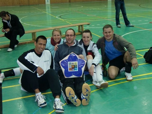 Bei diesem schönen Quatro-Mixed-Turnier dürfen nur SpielerInnen antreten die kleiner als 1,80m sind. Zudem gibt es Punktevorsprung wenn ein Team im Schnitt deutlich kleiner (z.B. 1,70m zu 1,76m =6 Punkte) als ein anderes ist. Mit Inna und Steffi hatten wir (Achim, Sascha, Andi) nun nicht gerade kleine Frauen dabei, so dass wir meist einem Punkterückstand hinterher laufen musten.