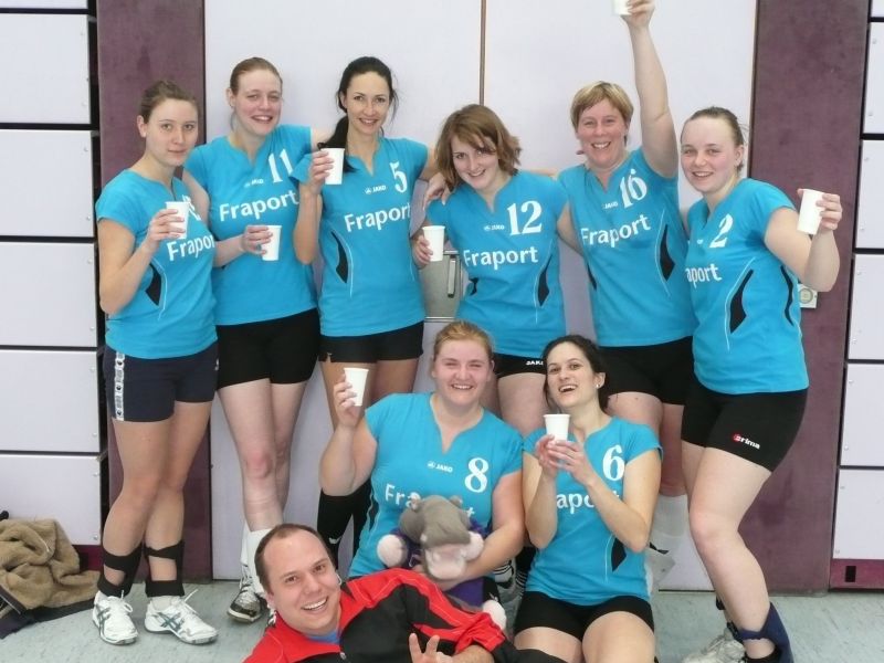 Nach 25:12 und 25:20 war es dann im dritten Satz bei 23:16 so weit: Trainer Christoph Schneider griff in seine Tasche und holte leicht nervös guckend sein Handy heraus. Schon in der 8. Spielminute war die SMS aus Sindlingen gekommen, doch die Nerven hätten das wohl nicht ausgehalten. 24:16 Trainer hat die SMS gelesen, "Punkt, Punkt, Punkt", ein Schmunseln im Gesicht, Satzball vergeben: 24:17 - inzwischen konnte Tiramisu- und Stimmungsgarant Christian Wiese die frohe Kunde lesen - "Punkt, Punkt, Punkt" - Aufschlag des Gegners, der Trainer nickt der mitgereisten Fanschaft zu "es ist geschafft" - die Mädels hechten dem Ball zu dritt hinter her, über die Netzkante, eine Abwehr und plumps - nach 59 Minuten liegt der Ball auf dem Boden, die Steine fallen vom Herzen, alle rennen zusammen und dann die - für viele zu diesem Zeitpunkt völlig überraschende - Botschaft "Königstein hat gegen Sindlingen im Tie Break verloren - Mädels, wir sind Meister!!!"