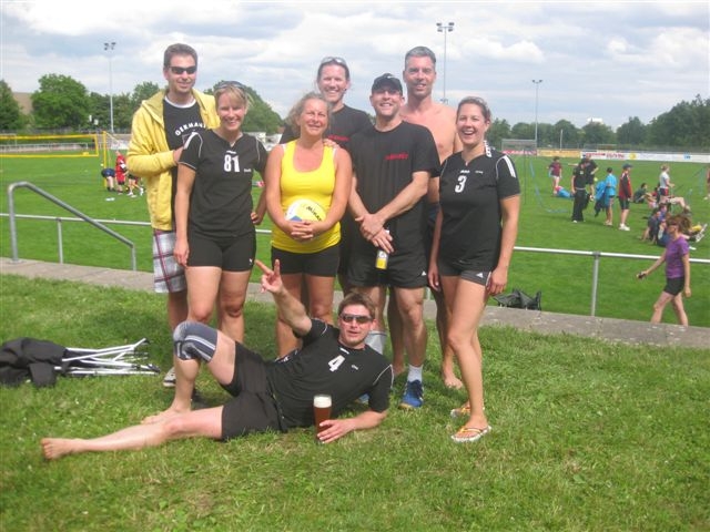 Die nĂ€chste Runde ging im gleichen Modus weiter. Alle Erst- und Zweitplazierten wurden wieder in Vierergruppen gesetzt. Am Samstag durften wir zunĂ€chst gegen die Bemblers ran. Das Niveau zog nun deutlich an doch unser Schlachtruf "Äppelwoi" setzte sich gegen die Bembelpower durch. Da wir sehr konzentriert spielten, konnten wir uns klar 2:0 durchsetzen. Kurz danach spielten wir unser letztes Spiel am Samstag gegen die "Fallenden Pottwale in Vanillesoße". Die Mannschaft der Ausrichter tröpfelte so nach und nach auf dem Spielfeld ein und wehrte sich lange um nicht wieder ihre organisatorischen Aufgaben wahrnehmen zu mĂŒssen. Wir versuchten allerdings schnell den 30 anderen Mannschaften die Gastgeber zurĂŒck zu geben. Mit nur wenigen Augenrollern konnten wir auch dieses Spiel mit 2:0 fĂŒr uns entscheiden. Da es schon recht spĂ€t war, brachen wir umgehend zum Grillabend mit Fußballgucken bei Liane und Ole auf. HĂ€tten wir gewusst was fĂŒr ein trauriges Deutschlandspiel uns erwartete hĂ€tten wir uns etwas mehr Zeit gelassen. DafĂŒr war es möglich noch das Ende des grandiosen 3:2 Siegs unserer Volleyballnationalmannschaft gegen Kuba zu sehen. NatĂŒrlich schauten wir uns einige TrickspielzĂŒge ab die wir dann am Sonntag dann 1:1 umsetzen wollten.